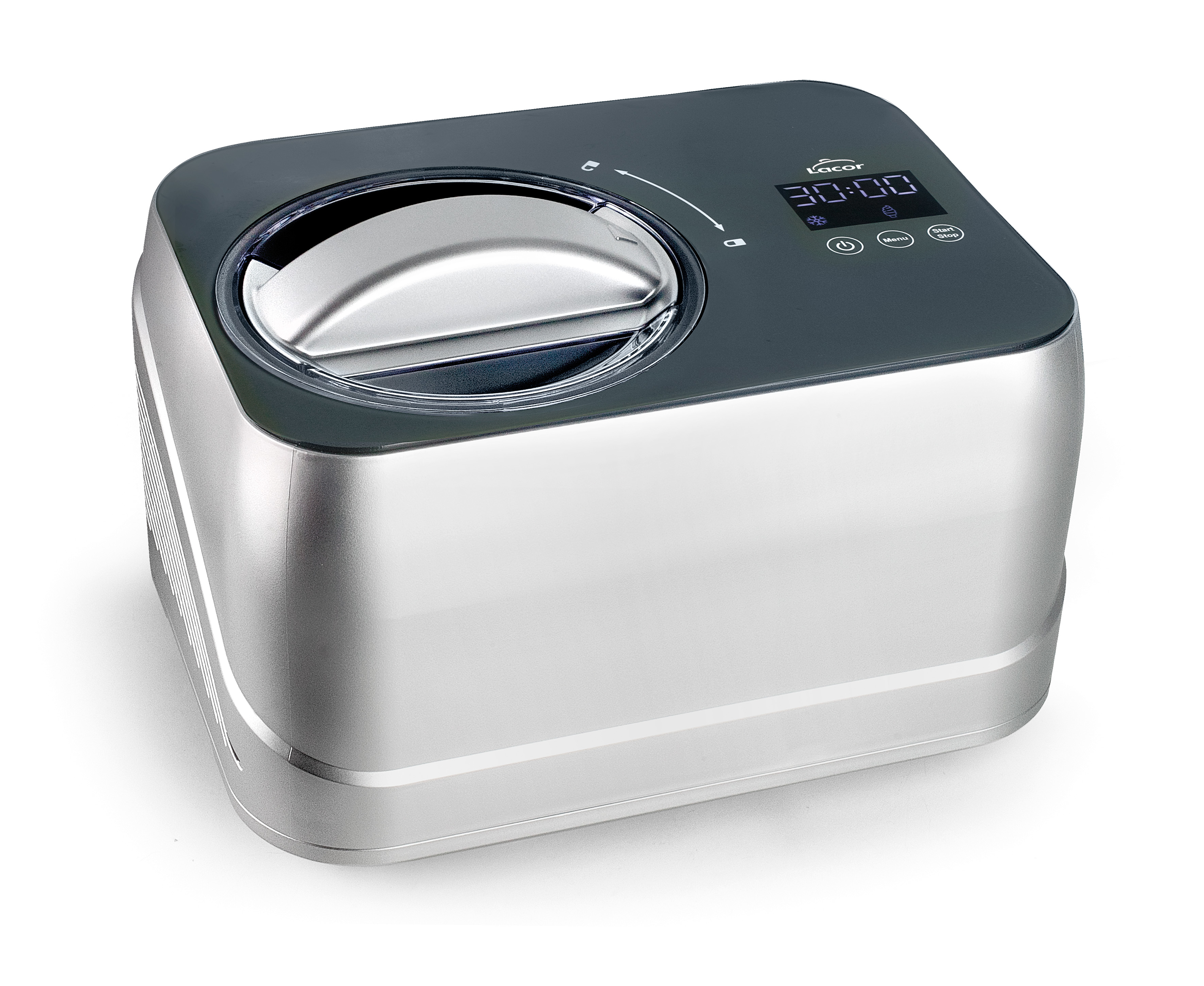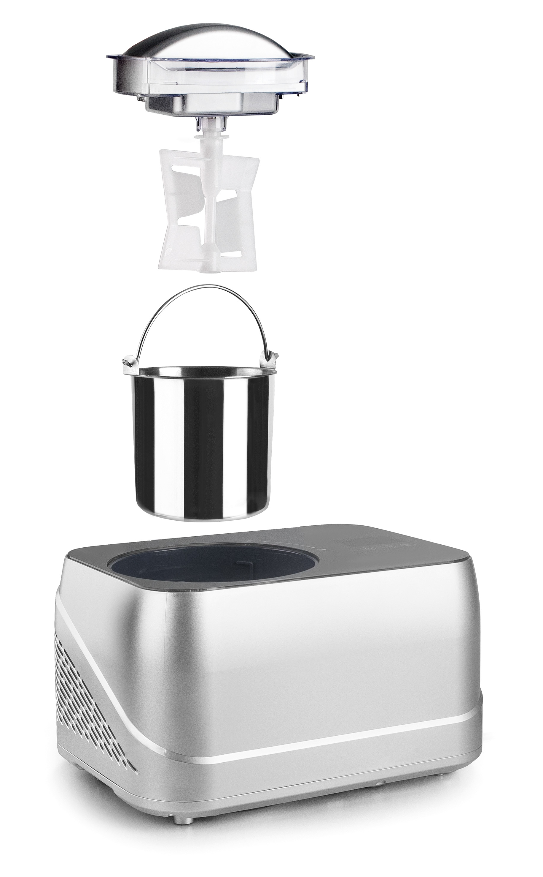 Design compact, 3 fonctions : glace (en 20 à 40 minutes), réfrigérateur (maintien du froid pendant 1 heure), mélange (sans la fonction de compression). Ecran tactile, conteneur amovible inox 18/10.
